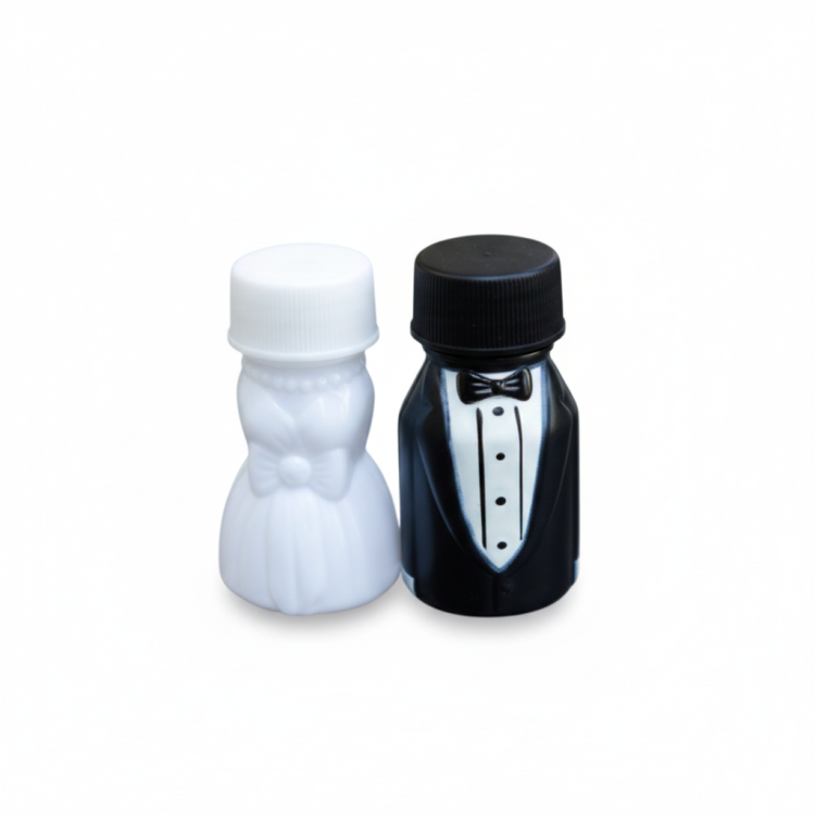 בקבוקי בועות סבון בעיצוב חתן וכלה – תוספת מושלמת לחתונות, חינות ואירועים מרגשים. כל בקבוק מעוצב בצורת דמות אלגנטית של חתן או כלה, ומכיל בועות סבון לשימוש מהנה וצילומי אווירה יפים במיוחד.
