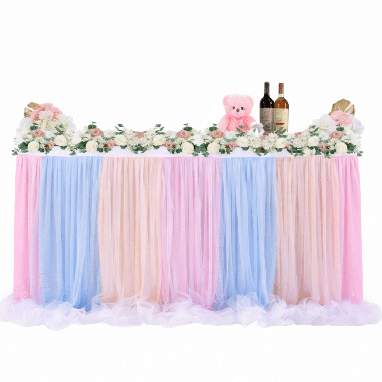 חצאית טול דקורטיבית בצבעי פסטל רכים, מושלמת לעיצוב שולחנות, במות ואזורי צילום באירועים חגיגיים.