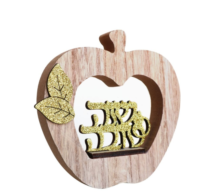 מעמד שולחן מעוצב בצורת תפוח – עשוי עץ טבעי עם חיתוך פנימי בצורת תפוח, עלים מנצנצים בצבע זהב וכיתוב "שנה טובה" בזהב מנצנץ.