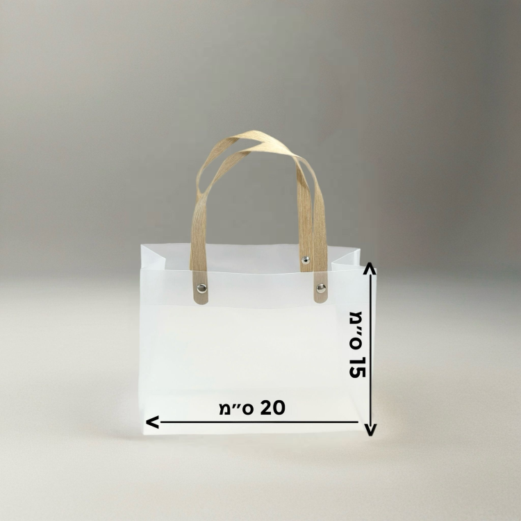 שקית נשיאה שקופה עם ידיות בצבע עץ בגימור מתכתי, עשויה חומר PVC גמיש ועמיד. השילוב של שקיפות וידיות מעוצבות מעניק לשקית מראה יוקרתי ואלגנטי, המתאים לאריזת מתנות קטנות, סידורי פרחים, בקבוקי יין קטנים ועוד.