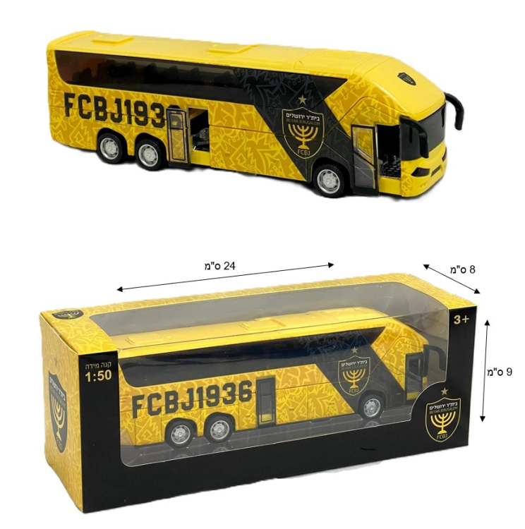 אוטובוס צעצוע מהודר בהשראת קבוצת בית"ר ירושלים, בקנה מידה 1:50, בעיצוב שחור-צהוב מרהיב עם כיתוב FCBJ1936 ולוגו הקבוצה.