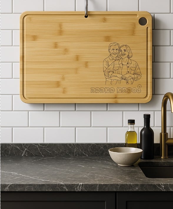 קרש חיתוך מעוצב מעץ טבעי ואיכותי, עם אפשרות לחריטה אישית של כיתוב, שם, הקדשה או אפילו איור דיוקן קו אישי. מתאים כמתנה מרגשת לחנוכת בית, זוגות, הורים, סבים וסבתות – או סתם לעצמכם, עם טאץ' ייחודי במטבח.