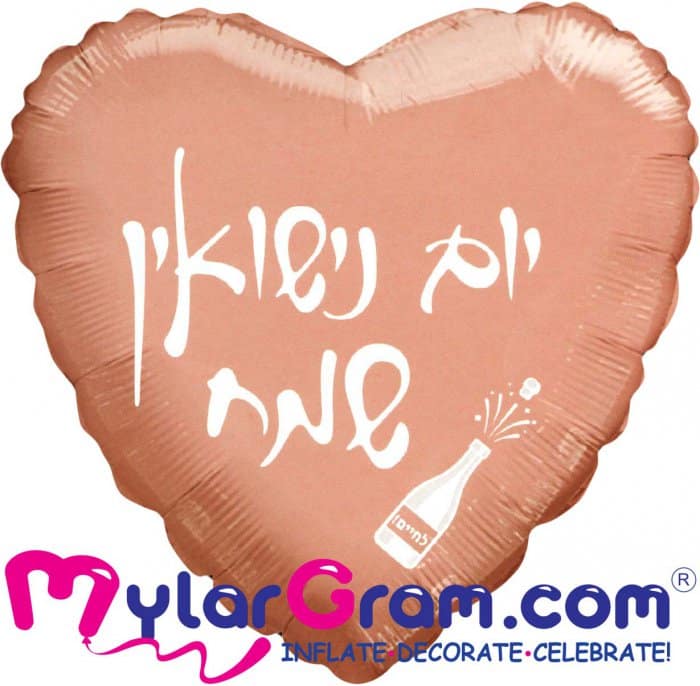 בלון מרגש בצורת לב בגוון רוז גולד אלגנטי, עם כיתוב לבן: "יום נישואין שמח" ובקבוק שמפניה מעוצב להשלמת האווירה. מתאים להפתעה רומנטית, קישוט חדר, מסיבת יום נישואין או צילומים מרגשים.