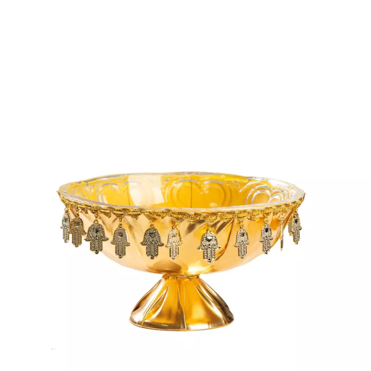 גביע חינה יוקרתי בגימור זהב מבריק, מעוטר בתליוני חמסה אלגנטיים.