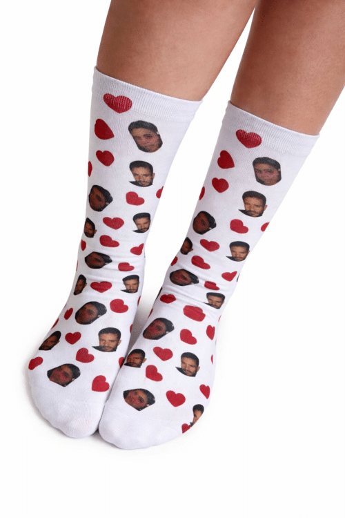 גרביים ייחודיות ומצחיקות בעיצוב אישי, עם הדפס של תמונת פנים לבחירה בשילוב לבבות אדומים. מתנה מקורית, מרגשת ומשעשעת שמתאימה ליום הולדת, יום האהבה, יום נישואין, מסיבת רווקים/רווקות או סתם כהפתעה אישית עם קריצה.