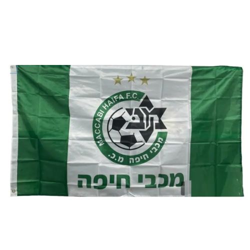 דגל מעוצב בצבעי ירוק ולבן עם סמל מכבי חיפה F.C. המקורי ו-3 כוכבים בחלקו העליון.