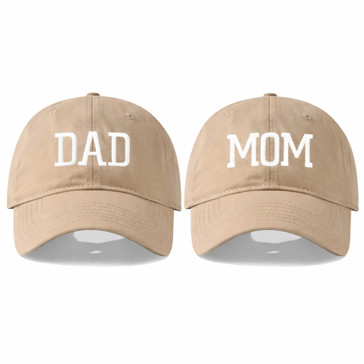 סט כובעי בייסבול זוגי עם רקמת DAD ו-MOM בלבן בולט — עיצוב נקי, גוון חול קלאסי שמתאים לכולם, ומידה אוניברסלית עם סגירה מתכווננת.