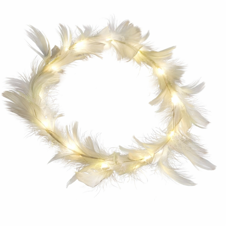 זר לראש בעיצוב עדין ואלגנטי, עשוי נוצות לבנות רכות ומשולב תאורת לד חמה ועדינה.