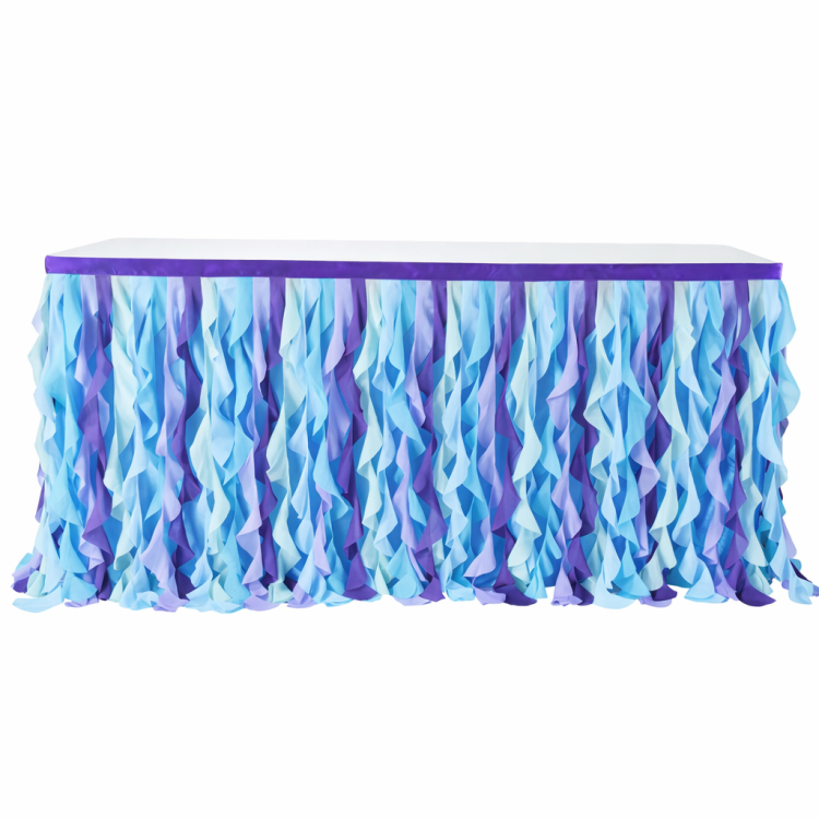 גודל: 1.83*0.77 מטרחצאית שולחן מעוצבת מבד טול רך, בגווני כחול וסגול בהשראת עולם הים. החצאית יוצרת מראה גלי, עשיר וצבעוני, ומעניקה לשולחן מראה מרשים וחגיגי במיוחד.