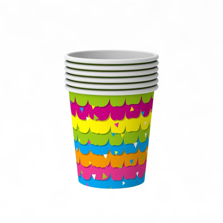 כוסות נייר צבעוניות בסגנון מקסיקני חגיגי, בהשראת פינטות, מסיבות פיאסטה והאווירה הססגונית של מקסיקו.