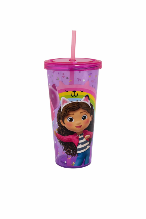 כוס פלסטיק איכותית וצבעונית עם קש ומכסה תואם, בעיצוב מתוק ואהוב של גבי מבית הבובות של גבי. הכוס מעוטרת בדמות גבי, קשת צבעונית ואיורים שמחים שהופכים כל שלוק לחוויה מהנה.
