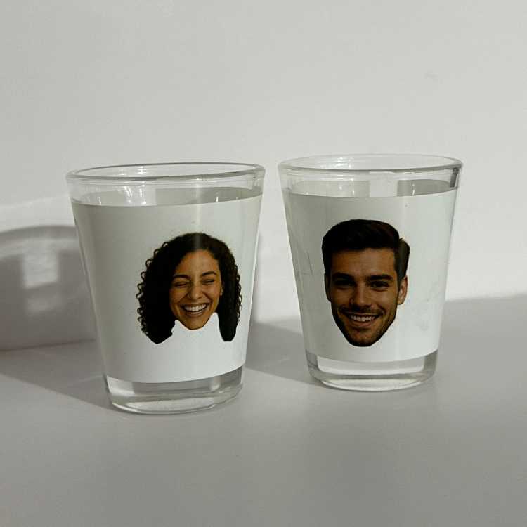 שוט זכוכית איכותי עם הדפסה של תמונה לבחירתכם – פנים, לוגו, או כל עיצוב אחר.