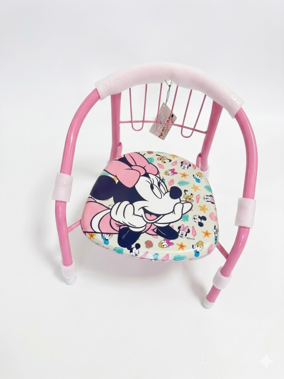 הכיסא עשוי שלדת מתכת חזקה ויציבה בצבע ורוד עם מושב מודפס בדמות מיני מאוס, ומתאים לחדר ילדים, לפינת יצירה, משחק וישיבה יומיומית.