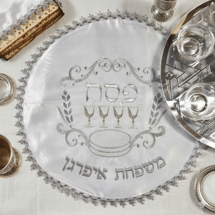כיסוי מצות לפסח בעיצוב אלגנטי עם רקמה יוקרתית בגווני כסף, המעוטר באיור של ארבע כוסות יין המסמלות את ארבעת לשונות הגאולה בליל הסדר. העיצוב החגיגי משלב איור מצות ועיטורים עדינים המעניקים לשולחן החג מראה מכובד ומרשים.   במרכז הכיסוי מופיע הכיתוב "פסח" ומתחתיו ניתן להוסיף רקמת שם משפחה בהתאמה אישית, מה שהופך את הכיסוי לפריט ייחודי ומיוחד לשולחן הסדר.   הכיסוי עשוי מבד איכותי עם שוליים מעוטרים, המוסיפים טאץ' יוקרתי וחגיגי לשולחן ליל הסדר.