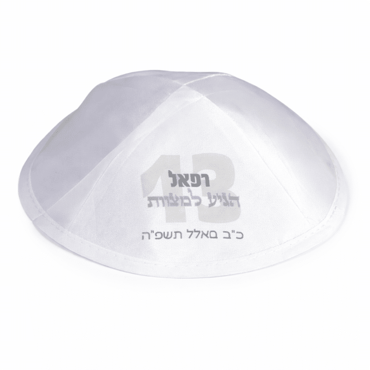 כיפת סאטן לבנה בעיצוב יוקרתי, מודפסת עם שם החתן, תאריך האירוע והמספר 13 – מושלמת לאירוע בר המצווה!