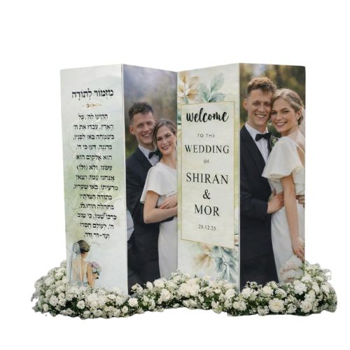 הקאפה מתקפלת בקלות, עומדת יציב על הרצפה או שולחן גדול, ומתאימה במיוחד לכניסה לאירוע, עמדת צילום, אזור קבלת פנים או עיצוב מרכזי באולם.