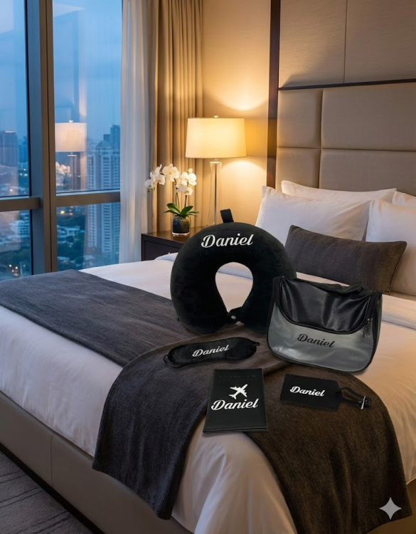ערכת נסיעות מושלמת הכוללת: כרית לצוואר, כיסוי עיניים, תיק רחצה, כיסוי לדרכון ותג שם למזוודה — עם שם בהתאמה אישית. אידאלית למתנה או טיסה נוחה בסטייל.