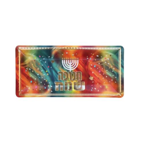 סט של 3 מגשי חגיגיים בעיצוב צבעוני ומבריק, עם כיתוב "חנוכה שמח" ומנורה מרכזית.