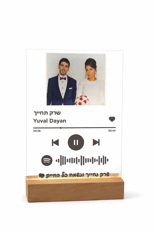 מנורת אקריל ייחודית עם תאורת לד חמה, בעיצוב בהשראת נגן ספוטיפיי – כוללת תמונה אישית, שם שיר, שם האמן, קוד סריקה מקורי ומסר מיוחד לבחירה. מתנה מרגשת לימי הולדת, זוגות, חתונה או פשוט כהבעת אהבה.