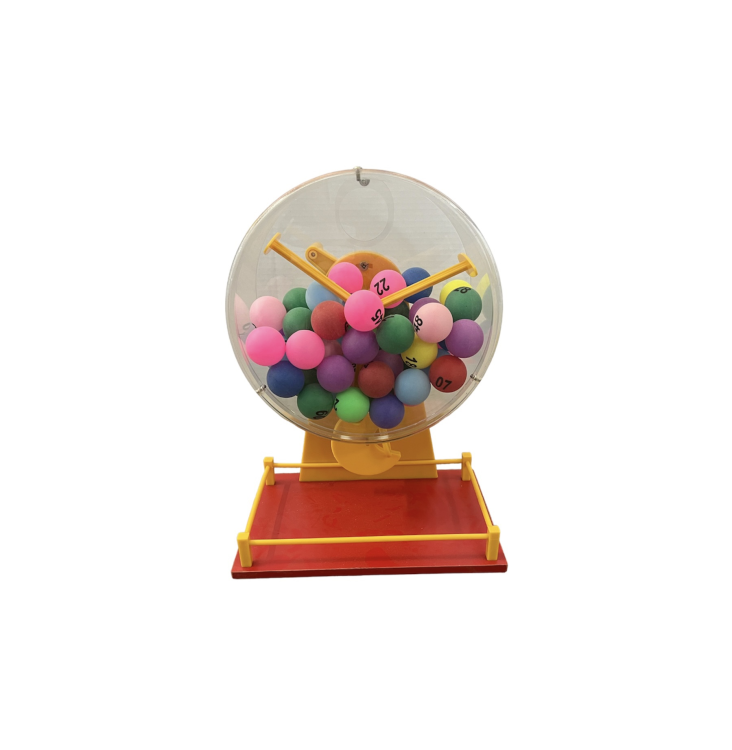 מכונת לוטו/בינגו צבעונית ומהנה עם כדורים ממוספרים.