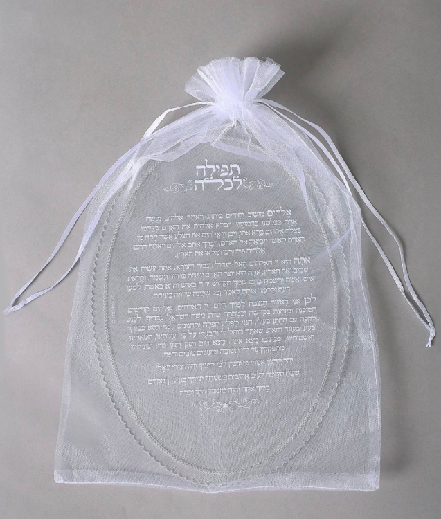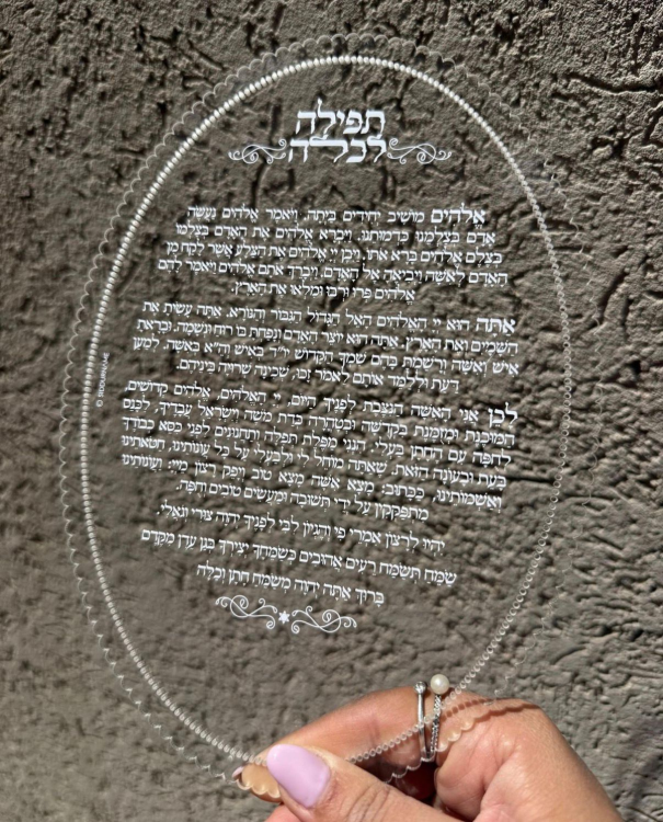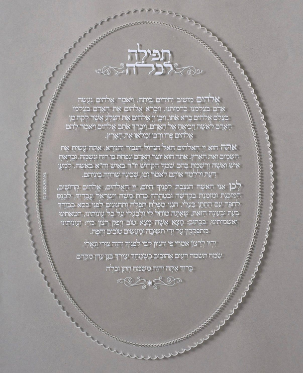 לוח אקריל שקוף ואיכותי עם חריטה לבנה בולטת של תפילה לכלה, בעיצוב אלגנטי ומרגש במיוחד. מגיע עטוף בשקית אורגנזה במקרה יוקרתי