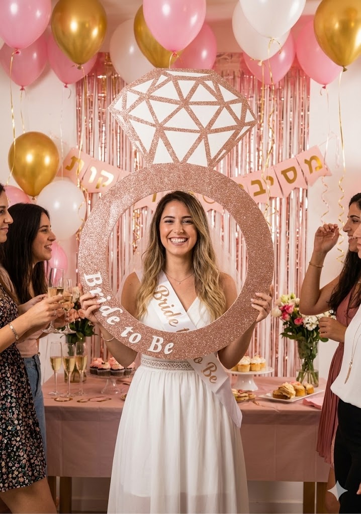 מסגרת צילום מהממת בעיצוב טבעת אירוסין מנצנצת בצבע רוז גולד, מושלמת לצילומי מזכרת במסיבת רווקות.