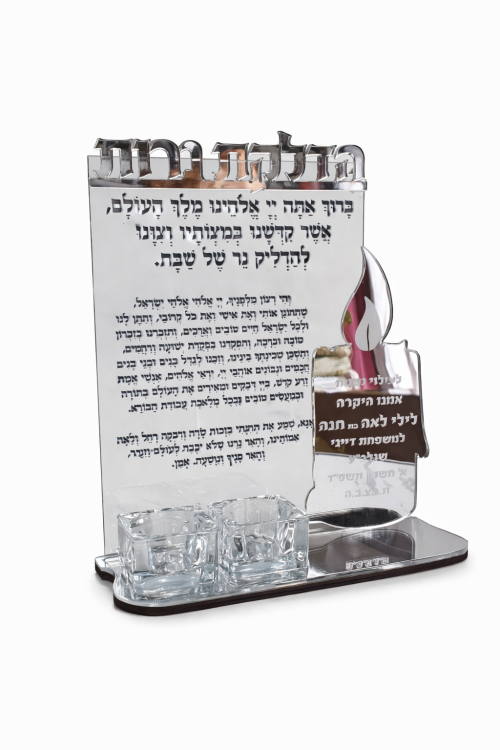 מעמד יוקרתי ומרשים להדלקת נרות שבת, עשוי מראה איכותית בגימור אלגנטי עם כיתוב ברכת הדלקת נרות בעיצוב קלאסי. כולל בסיס יציב ושני בתי נרות מזכוכית, המשתלבים בצורה מושלמת עם המראה ויוצרים מראה נקי, מכובד ומלא קדושה.