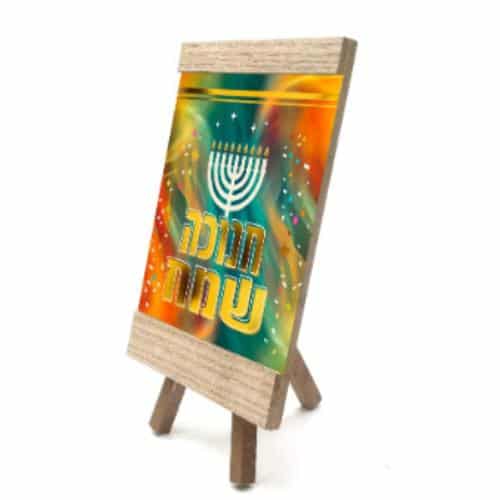 שלט עיצוב חגיגי בעיצוב “חנוכה שמח” צבעוני ומבריק, מוצג על גבי כן ציור קטן מעץ טבעי.