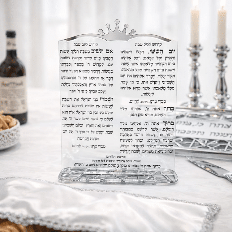 מעמד קידוש מרשים ומעוצב לשולחן השבת, הכולל לוח שקוף עם נוסח הקידוש וברכת הלחם בעיצוב אלגנטי וכתר מלכותי. הבסיס המהודר מעניק יציבות ומראה יוקרתי שמשדרג כל שולחן שבת וחג.