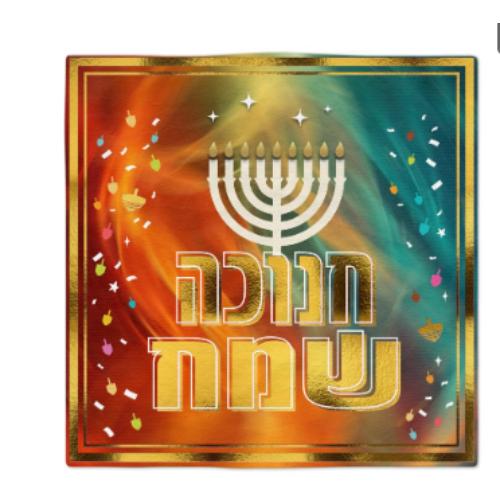סט מפיות נייר חגיגיות בעיצוב צבעוני ומרהיב, עם כיתוב זהוב "חנוכה שמח" ומנורת חנוכה אלגנטית.