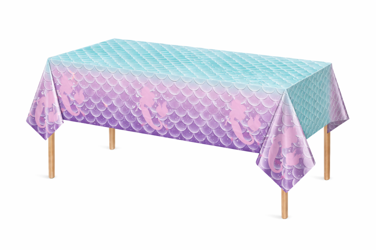 מפת שולחן מרהיבה בעיצוב בת ים בגווני טורקיז-סגול עם בת הים הקסומה – מושלמת למסיבת יום הולדת, מסיבת בנות או כל חגיגה בסגנון תת-ימי.