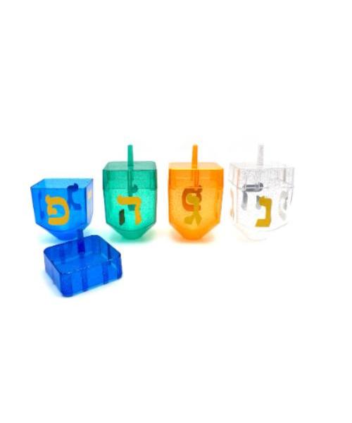 סביבון שקוף ומעוצב, בעל מראה צבעוני וחגיגי, המתאים במיוחד למילוי סוכריות ומתנות קטנות לחנוכה.