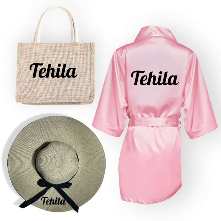 סט יוקרתי ומעוצב הכולל חלוק סאטן ורוד ותיק יוטה איכותי – כולם עם שם אישי בהתאמה אישית.