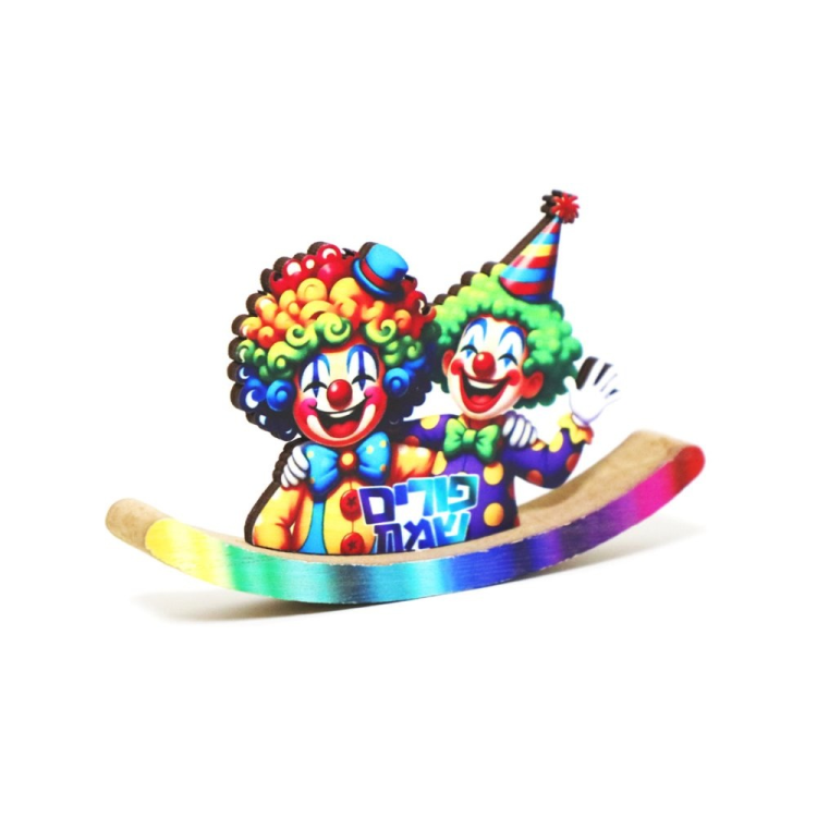 קישוט שולחן מתוק ושמח בעיצוב ליצנים צבעוניים לפורים, עשוי עץ עם בסיס מעוגל ויציב.