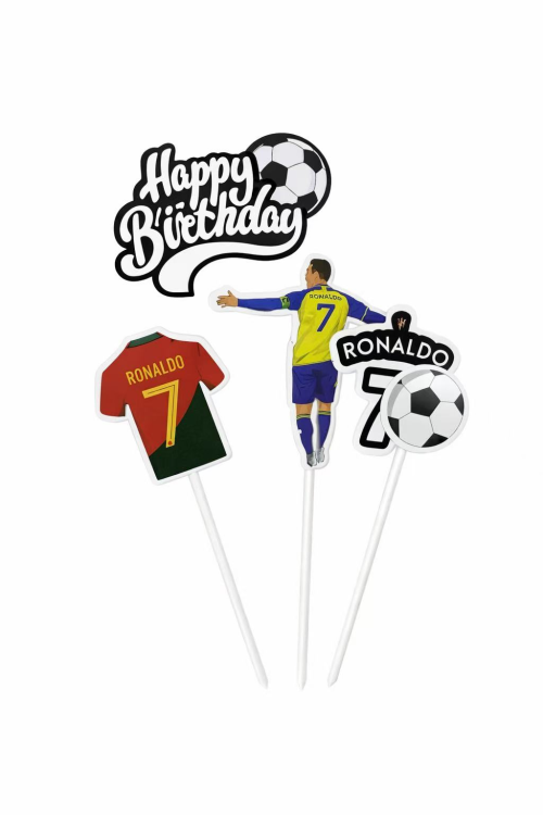 סט טופרים מרשים לעוגת יום הולדת בהשראת רונאלדו, הכולל דמות שחקן מפורסם עם החולצה הצהובה, כדורי כדורגל, כיתוב “Happy Birthday”, הספרה 7 ונעל כדורגל. הסט יוצר מראה חגיגי, ספורטיבי ומלא אנרגיה – מושלם לכל אוהד כדורגל צעיר.