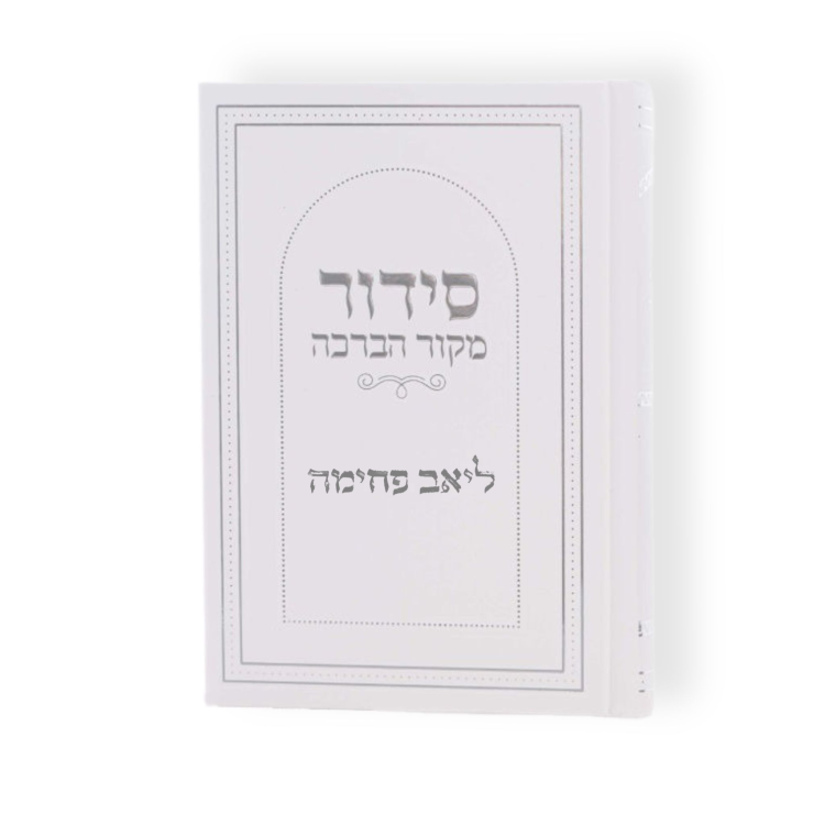 סידור מעוצב ואלגנטי בכריכה קשה בצבע לבן עם הטבעה עדינה ומסגרת דקורטיבית נקייה. על הכריכה מופיע הכיתוב "סידור מקור הברכה" ובמרכז ניתן לשלב הקדשה אישית — מתנה מרגשת ומכובדת לאירועים, שבתות וחגים.