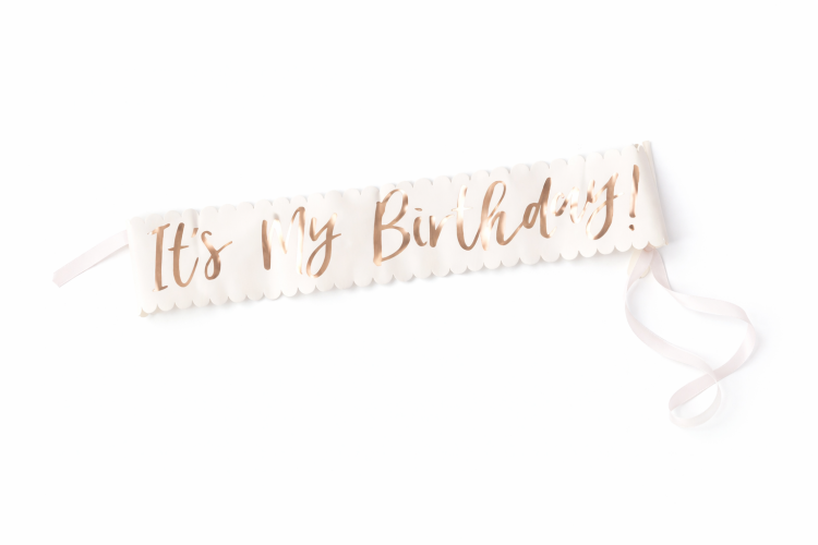 סרט לגוף בצבע רוז גולד עם הכיתוב its my birthday , אביזר חובה לחוגגת היום הולדת.