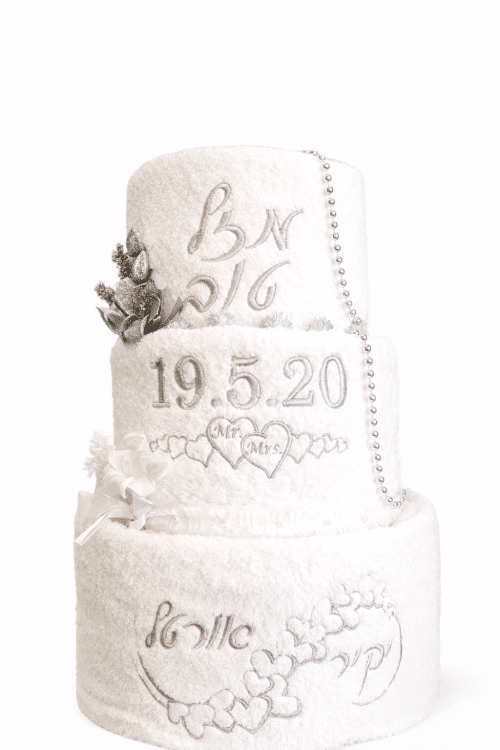 עוגת מגבות בעיצוב קלאסי, זמינה בגווני כסף זהב ושחור הכל בהקדשה אישית.