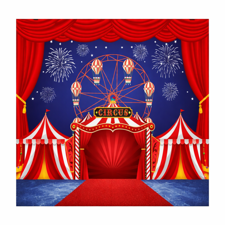 רקע עיצובי מרהיב בהשראת עולם הקרקס, עם אוהלי קרקס אדומים, גלגל ענק, זיקוקים ווילונות תיאטרליים – ליצירת אווירה שמחה, צבעונית ומלאת קסם. מושלם כאלמנט מרכזי בעיצוב אירועי ילדים ומסיבות קונספט.