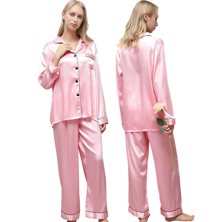 פיג'מת סאטן ורודה לנשים – סט ארוך ומהודר