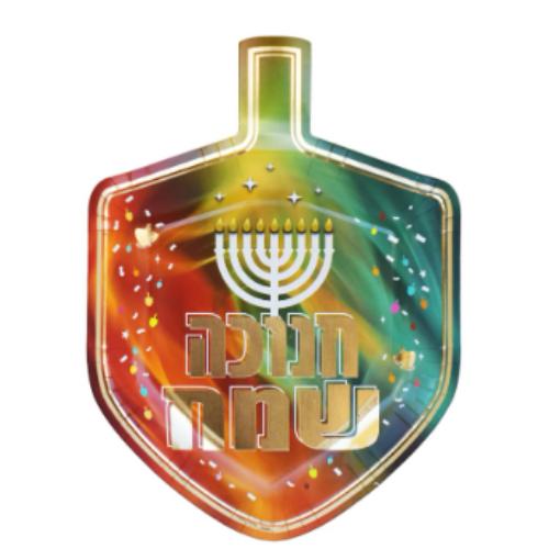 צלחות נייר חגיגיות בעיצוב סביבון צבעוני עם כיתוב זהוב "חנוכה שמח" ומנורת חנוכה במרכז.