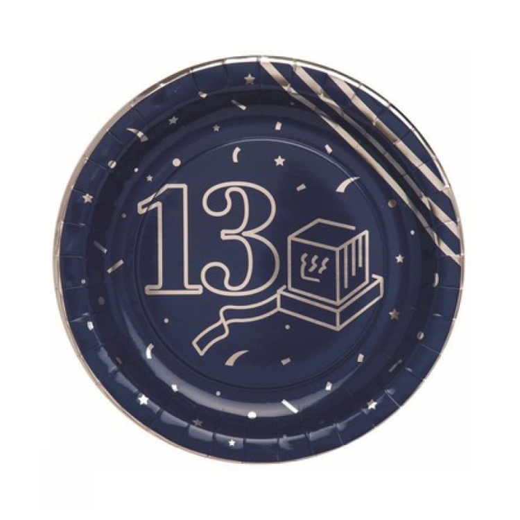 צלחות קרטון חגיגיות בעיצוב בר מצווה בצבע כחול כהה עם הדפס כסוף של הספרה 13 ודוגמאות קישוט נוספות. מושלם לעיצוב שולחן מיוחד ומרשים לאירוע.