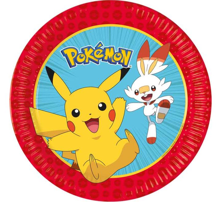 צלחות נייר בעיצוב מקורי של Pokémon, עם הדפס צבעוני ושמח של פיקאצ'ו וחבר נוסף מהסדרה האהובה.