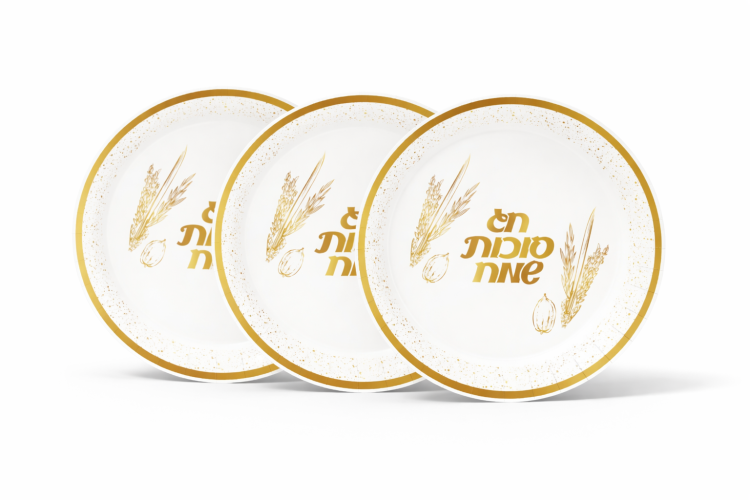 צלחות חד־פעמיות בעיצוב אלגנטי בצבע לבן עם הדפס זהב יוקרתי וכיתוב “חג סוכות שמח”.