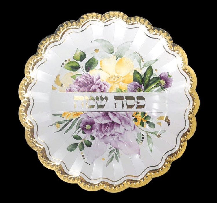 צלחות קטנות פסח שמח נייר עם עיטורי זהב.