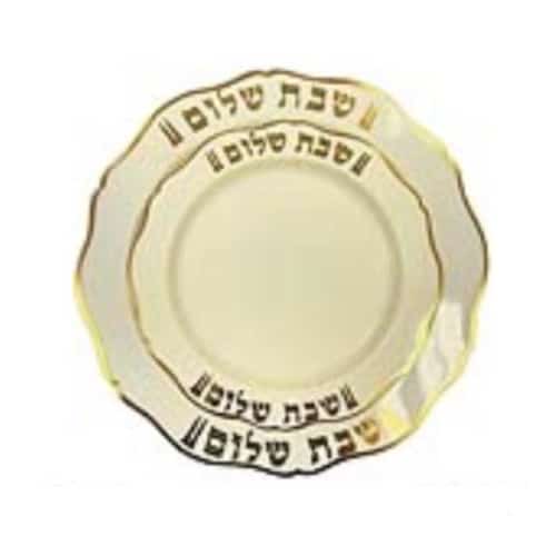 סט יוקרתי ומעוצב של צלחות פלסטיק בצבע קרם עם הדפס זהב "שבת שלום".