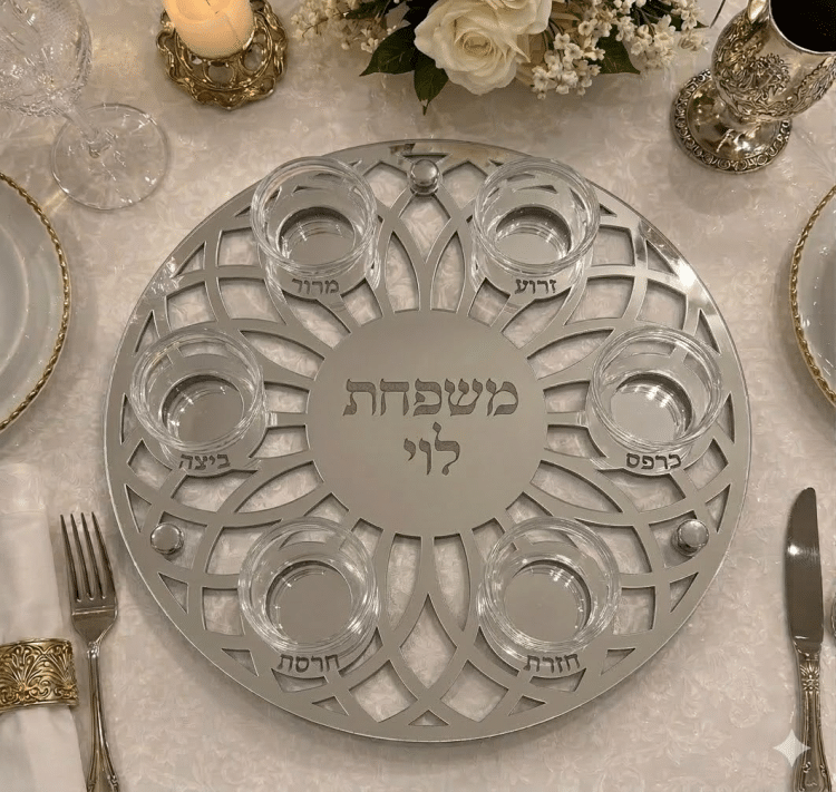 צלחת סדר לפסח בעיצוב מנדלה גאומטרי מרהיב, המשלב אלמנטים עדינים היוצרים מראה יוקרתי וחגיגי במרכז שולחן ליל הסדר. העיצוב המיוחד מעניק לצלחת נוכחות אלגנטית ומשתלב בצורה מושלמת עם עיצוב שולחן החג.