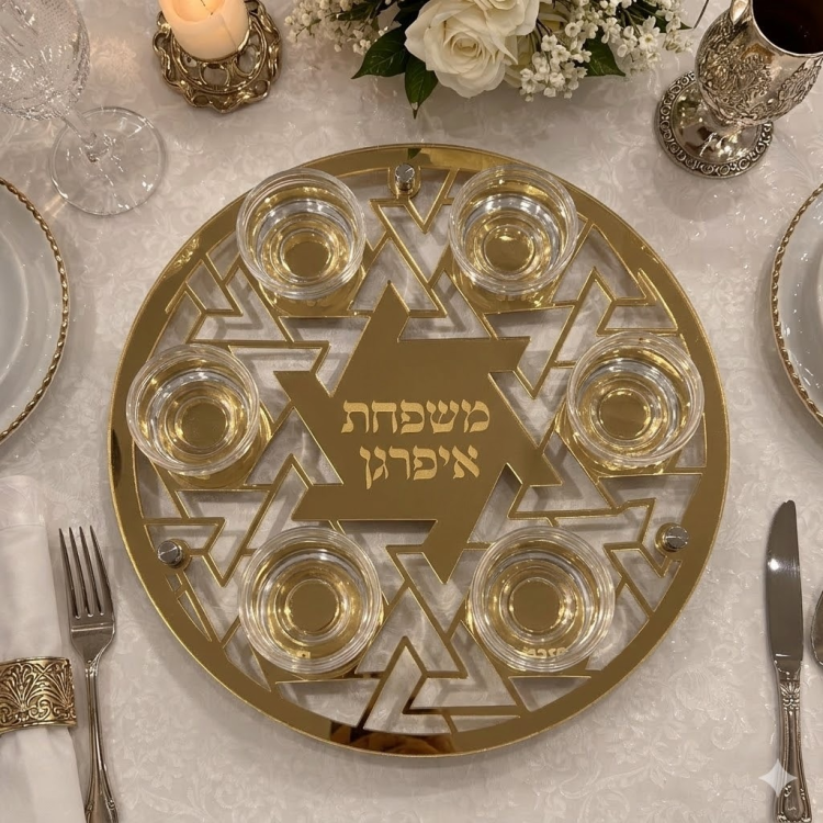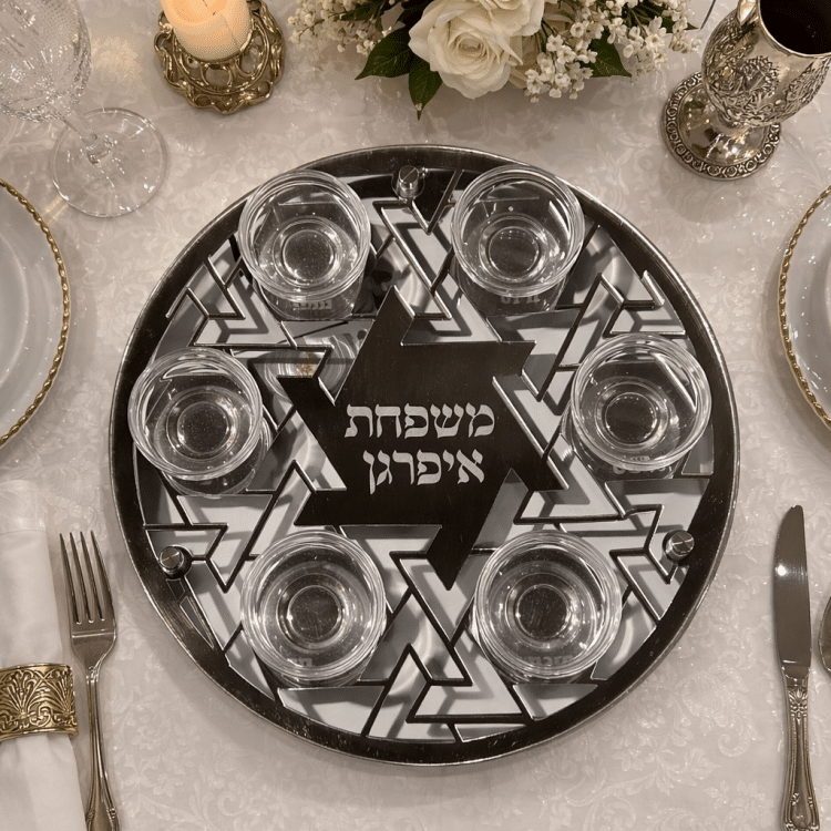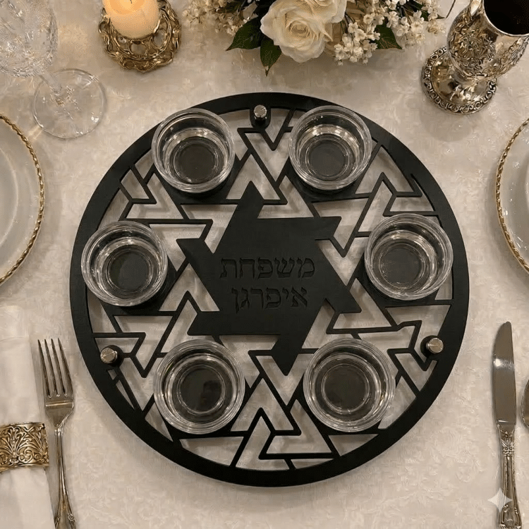 צלחת סדר לפסח בעיצוב גאומטרי מרשים בהשראת מגן דוד, המעניקה לשולחן החג מראה יוקרתי ומיוחד. הצלחת משלבת חיתוכים עדינים ועיצוב מודרני היוצרים נוכחות אלגנטית ומרשימה במרכז שולחן ליל הסדר.