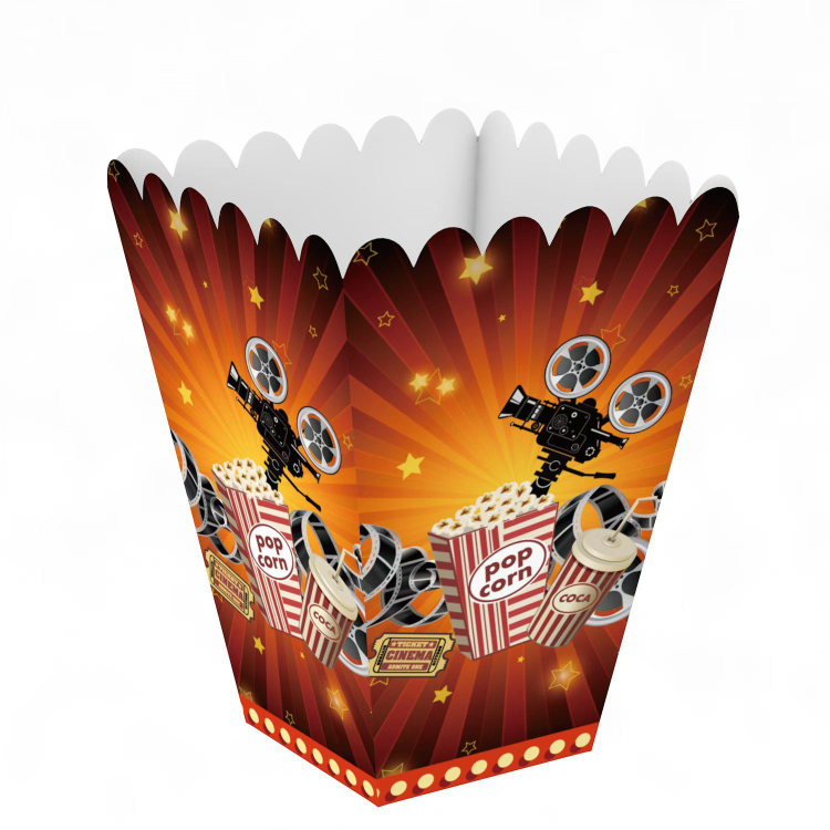 קופסאות פופקורן צבעוניות ומרשימות בסגנון קולנוע הוליוודי, עם הדפס של פופקורן, מצלמות סרטים, סלילי פילם וכוכבים – מושלם לערבי סרט, ימי הולדת, מסיבות בית וקונספט קולנועי.