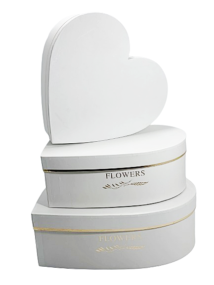 שלישיית קופסאות קשיחות בצורת לב, בעיצוב קלאסי בצבע לבן עם גימור זהוב עדין. מושלמות לאריזת מתנות מרגשות – תכשיטים, שוקולדים, פרחים או הפתעות אישיות.